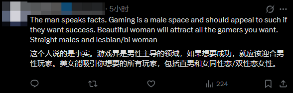 推文发布后,评论区迅速引发热议。不少玩家表示认同博主的看法,认为多数玩家群体本就是异性恋男性,他们的喜好自然能代表更广泛的市场需求,这是正常的市场规律。