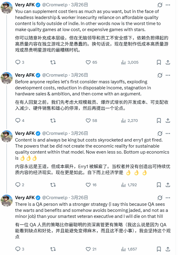 他进一步解释了反对低价的原因,结合当下游戏行业的现状,大规模裁员频发、游戏开发成本持续飙升,再加上消费者可支配收入不断减少,这种指望“廉价优质内容”的商业模式本身就充满风险。“无论你如何调整成本层级,在缺乏领导力和工人安全感的现实面前,依赖低成本的优质内容只是空想。现在是最不适合以低成本制作优质游戏、或以高价制作明星产品的时候。”