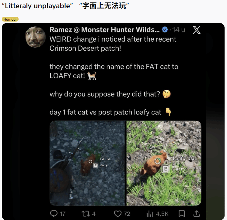据playground消息,Pearl Abyss作为《红色沙漠》的开发方,近期上线了一则更新,这则更新很快在玩家之间引发不小的波澜。在游戏英文版中,此前一直被玩家喜爱的“胖猫”(fat cats),被正式调整为“面包猫”(loafy cats),而且这次名称变更并非只涉及一处,游戏内的UI界面、图鉴以及成就系统里,所有相关名称都被统一替换。Reddit上有一篇题为“简直没法正常玩了”的帖子,围绕这次改名展开讨论,目前已经积累了数百条玩家留言。