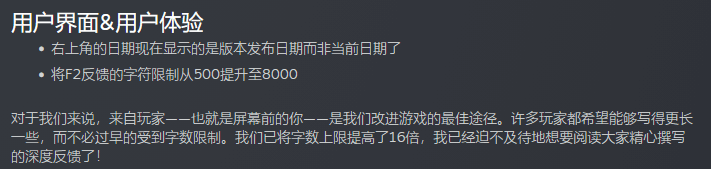 除了扩大字符限制,官方还在更新日志开头特意呼吁玩家多使用F2反馈工具,强调这些反馈在指引游戏开发方向上起到了至关重要的作用。对于玩家反馈的语言问题,官方也给出了包容的态度,直言“不论读起来多么困难,我都希望能看到更多的F2反馈”,打消了玩家因语言表达顾虑而不愿提交意见的念头。