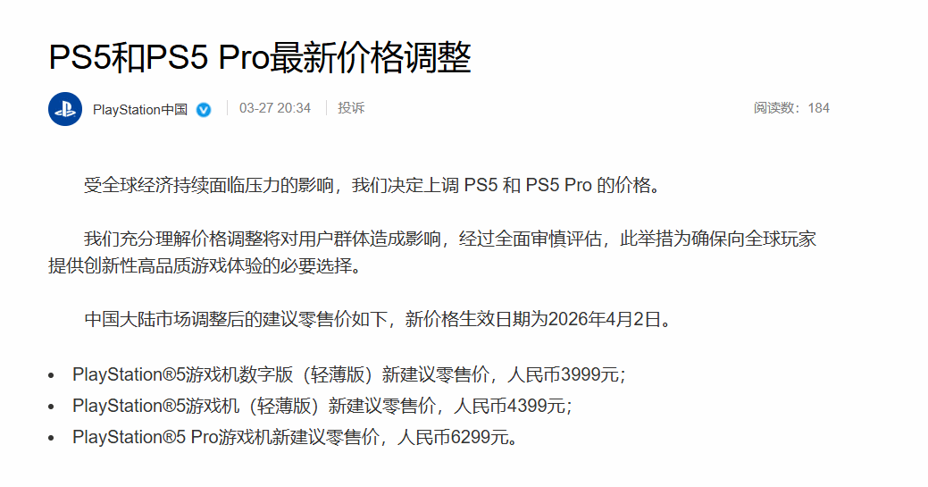 在索尼宣布全球范围内上调PS系列产品价格后,中国大陆市场的调价方案也随之出炉。3月27日,PlayStation中国正式发文,确认将上调国行PS5及PS5 Pro的建议零售价,此次调价与全球调价同步,新价格将于2026年4月2日正式落地执行。