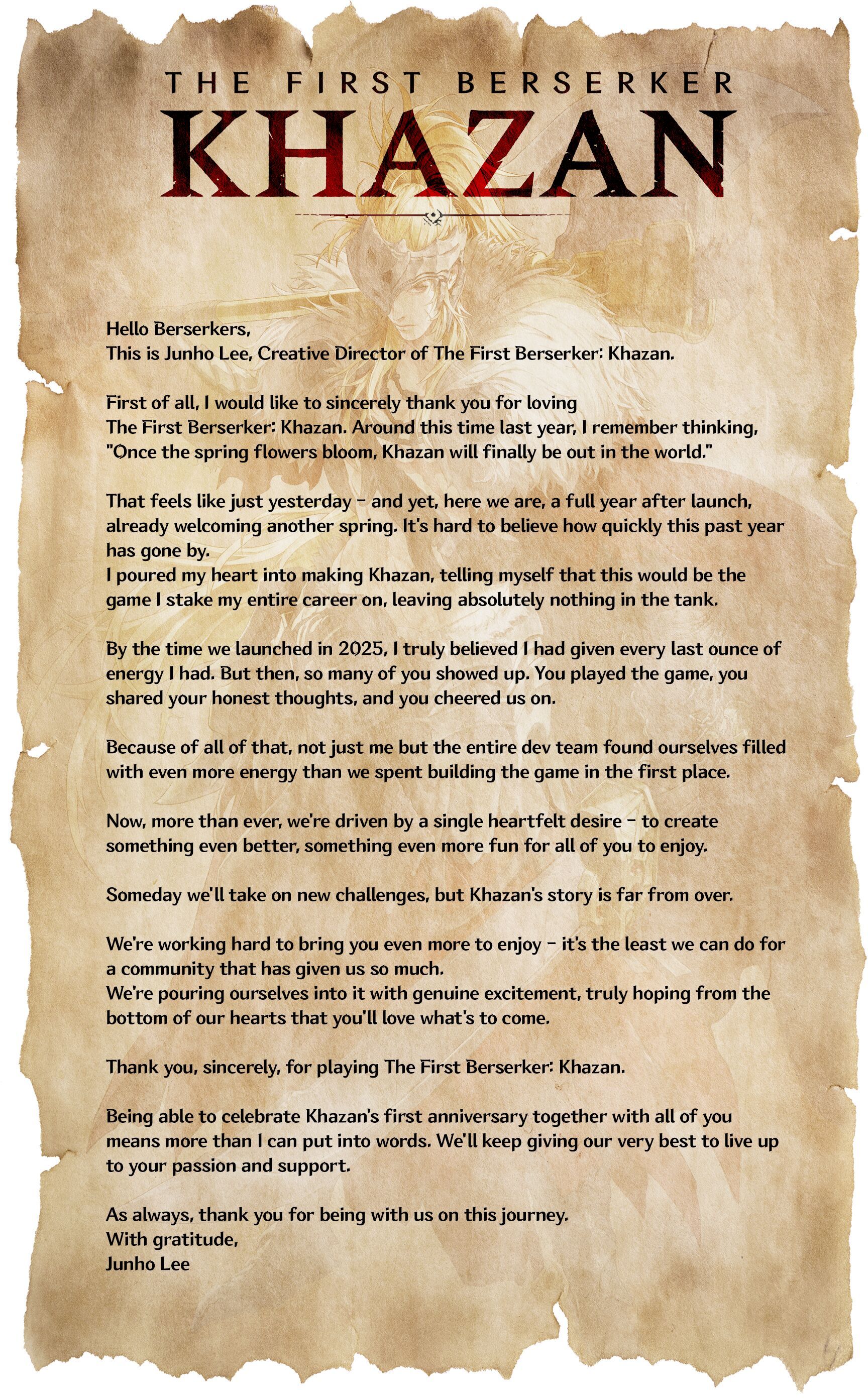 3月27日,动作角色扮演游戏《第一狂战士:卡赞》迎来发售一周年。开发商Neople与发行商Nexon回顾了游戏首年的运营情况,并公布了创意总监李俊浩的公开信,确认未来将持续更新内容。