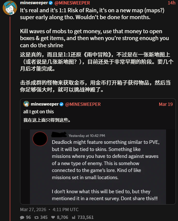 根据爆料信息,这款全新PVE模式的玩法,与《雨中冒险》的核心玩法高度契合:玩家将进入全新打造的地图,在一波波敌人的围攻下坚守阵地、获取货币,再用所得货币开启宝箱、收集各类道具,等到自身实力累积到位后,再向最终Boss发起挑战,整体循环延续了经典的肉鸽玩法逻辑。