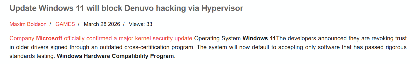 这一安全策略的调整,最直接的影响便是近期由黑客“DenuvOwOA”掀起的破解热潮。据悉,此前黑客们想要绕过Denuvo防篡改技术——这种广泛应用于各类游戏大作、用于防止游戏被非法复制和修改的技术,核心方式就是操控系统中的“虚拟机监控器(Hypervisor)”。而从技术层面来说,要实现这种操控,必须向系统内核加载特定的、未经过签名或是存在漏洞的第三方驱动。