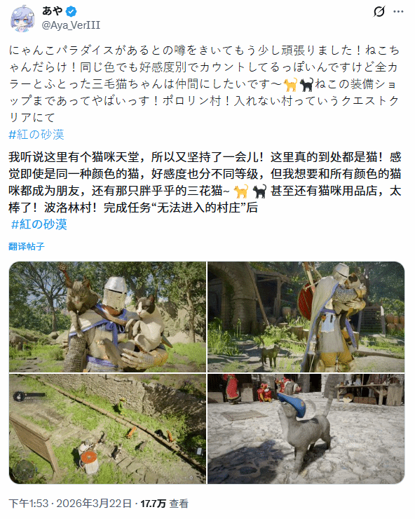 在《红色沙漠》的虚拟世界里,玩家们除了探索冒险,还意外发现了一种能治愈人心的玩法——和游戏中的猫咪相处。日前,有玩家耗时许久,将30只猫咪聚集在一起,组成了一支特别的“猫军团”,这一做法很快在爱猫玩家之间传开,引发了不少讨论。