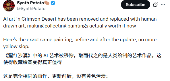 其实官方在此前就已发布声明,承诺会全面审查游戏内容,并彻底移除所有AI生成素材。如今这一整改举措正式落地,得到了玩家们的广泛认可。大家普遍认为,手绘艺术不仅让游戏内的绘画收藏玩法重新变得有价值,更整体提升了《红色沙漠》的美术质感,也能感受到官方对待玩家反馈的诚意。