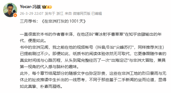 冯骥在微博中直言,自己一直以来都在关注作者曹丰泽,即便此前已经在视频平台上刷到过不少关于非洲的见闻,但阅读这本纸质书所带来的完整时间线,以及作者字里行间传递的一线思考,依然让他觉得格外珍贵。