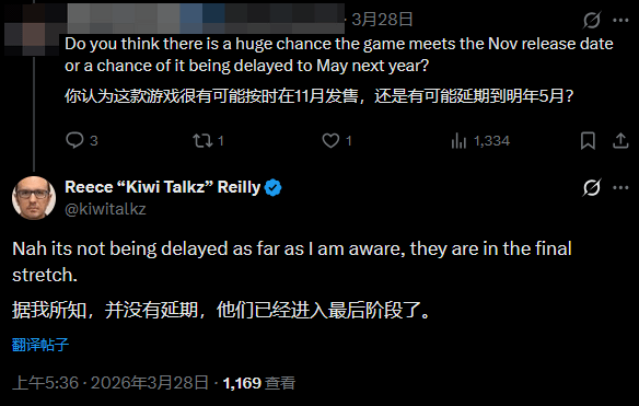 有玩家在互动中向Kiwi Talkz询问《GTA6》能否按计划在11月推出,对方明确表示,这款游戏不会再度延期,当前开发工作已经进入最后的冲刺环节。