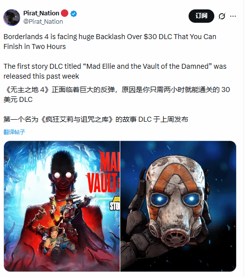 Gearbox为《无主之地4》推出的首款剧情扩展包《狂野艾丽与诅咒秘藏》正式上线后,立刻在玩家社群引发强烈不满。这款DLC定价29.99美元,却被大量玩家实测主线流程仅需两小时左右,性价比严重失衡,不少人直言开发商此举就是单纯“割韭菜”。
