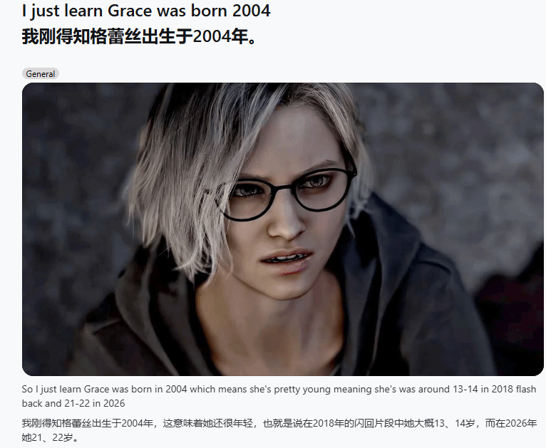 reddit平台的生化危机专区近期因一则帖子热闹起来,有玩家在帖子中分享了自己的发现:《生化危机9:安魂曲》的女主角格蕾丝,出生于2004年,属于标准的00后。按照时间线推算,2018年游戏闪回片段中她年仅13至14岁,到2026年故事发生时,也才21至22岁,这一设定让不少玩家直呼“比自己还年轻”。