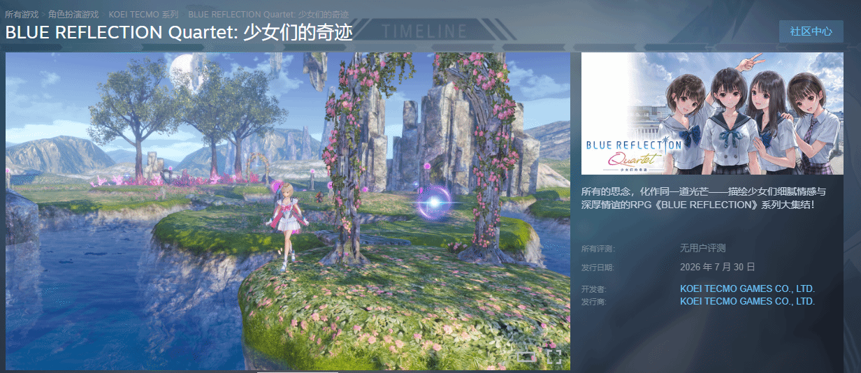 光荣特库摩近期正式官宣,旗下美少女RPG系列合集《BLUE REFLECTION Quartet:少女们的奇迹》,确定于7月30日登陆多平台,涵盖PC、PS5、Nintendo Switch以及Nintendo Switch 2,满足不同玩家的体验需求。