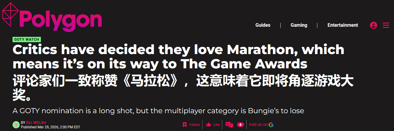 该专栏作者Oli Welsh在文章中分析,《失落星船:马拉松》或许难以成为销量爆款,其市场表现甚至可能让索尼这样的发行商感到不满,但这款游戏已经成功俘获了游戏媒体的青睐。他表示,这种媒体层面的高认可度,让Bungie在TGA颁奖礼上占据了优势,尤其是在“最佳多人游戏”奖项的竞争中,几乎没有对手,同时也存在一丝冲击“年度游戏”提名的可能。