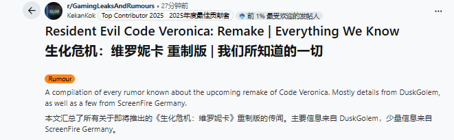 《生化危机:代号维罗妮卡》重制版的相关传闻被正式汇总曝光,这些消息来自海外游戏论坛r/GamingLeaksAndRumours的用户整理,主要依托爆料人DuskGolem的信息,部分内容参考了ScreenFire Germany的相关报道。值得一提的是,Dusk Golem作为《生化危机》系列知名爆料人,曾准确提前透露《生化9》中里昂会登场,但他分享的情报数量较多、质量不一,因此也提醒玩家对这些传闻保持观望,最终以官方公告为准。