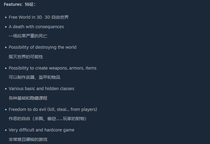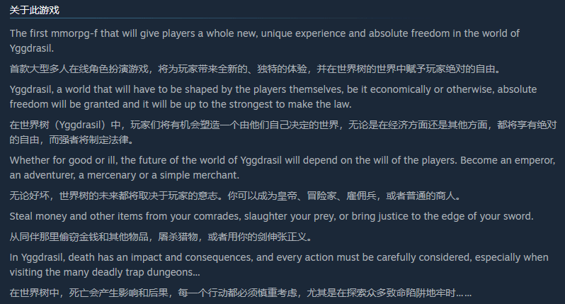 开发者在游戏介绍中表示,本作将成为首款“F类MMORPG”,主打全新独特的游玩体验,整个游戏世界需要玩家亲手塑造,无论是经济体系还是规则设定,都由玩家主导,最强者将拥有制定规则的权力。在这里,玩家拥有绝对的自由,无论选择行善还是作恶,都能决定世界的未来——可以成为统治一方的皇帝、仗剑天涯的冒险者,也能做一名唯利是图的雇佣兵、踏实经营的普通商人,既可以从同伴手中夺取财物、猎杀目标,也能执剑伸张正义。