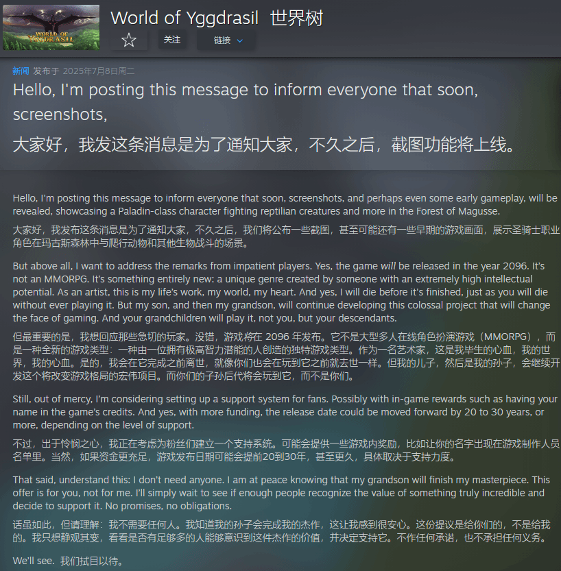 关于为何要等到2096年才发售,开发者早在2025年7月8日就发布过一条说明,他表示,这款游戏旨在开创一种全新的游戏类型,一种需要极高智慧才能完成的独特类型。“是的,在它完成之前我就会离世,就像你们也无法在有生之年玩到它一样。但我的儿子,随后是我的孙子,将继续开发这个庞大的项目,它将改变游戏的面貌。而最终玩到它的,将是你们的子孙后代——不是你,而是你的后代。”