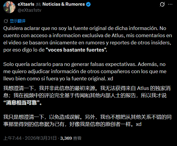 不过就在爆料引发热议后,eXtas1s迅速发文补充说明,明确表示自己并非这条消息的原始爆料者,也没有获得来自Atlus的独家信息。他在视频中提到的内容,仅仅是基于其他爆料者的传闻和相关报告整理而来,并非有确切依据的实锤消息,同时他也提醒玩家,需理性看待此次传闻,切勿过度期待。