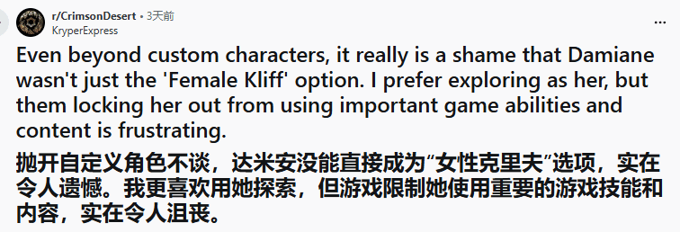 不少玩家本身就对主角克里夫缺乏好感,原本满心期待Pearl Abyss能完善德米安的玩法,借助这个角色让这款开放世界RPG的体验更具多样性,可实际游玩后,大家的期待都落了空。Reddit上有玩家发帖吐槽,德米安不该只是克里夫的“女性翻版”——他很喜欢操控德米安探索游戏的广阔世界,却发现这个角色无法使用游戏中诸多关键技能,这些能力被独家开放给了主角克里夫。