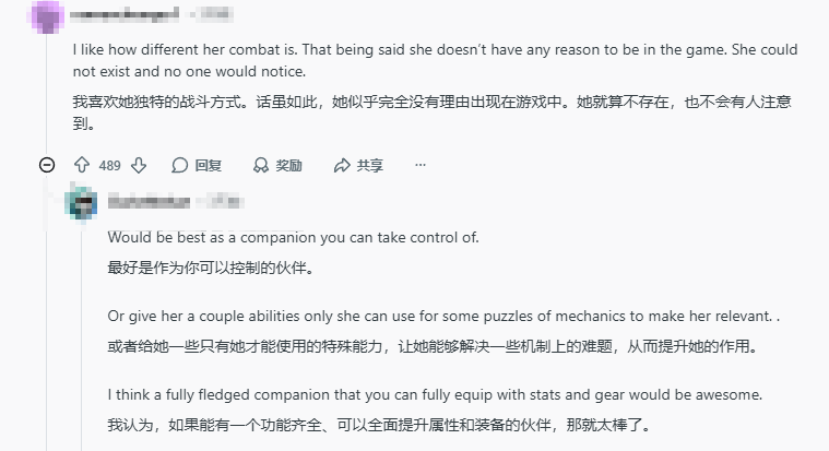 这篇吐槽帖引发了玩家们的共鸣,大家观点高度一致。有玩家表示,自己很喜欢德米安独特的战斗风格,却无奈这个角色在游戏中毫无存在感,即便将其删除,也不会对游戏体验产生任何影响。同时,玩家们也提出了不少优化建议,有人希望将德米安改为可临时操控的伙伴,也有人期待她能真正成为“女性版克里夫”,更深入地融入主线剧情,所有人都认可,德米安身上还有大量未被挖掘的潜力。