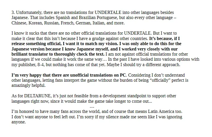 此次TobyFox在社交媒体上主动回应这一问题,向因语言限制无法顺畅体验游戏的玩家表达歉意,他坦言:“我不希望任何人感到被忽视。如果我之前的沉默让人觉得我在无视大家,我在这里表示抱歉。”同时,他也详细解释了仅支持日英双语的原因。