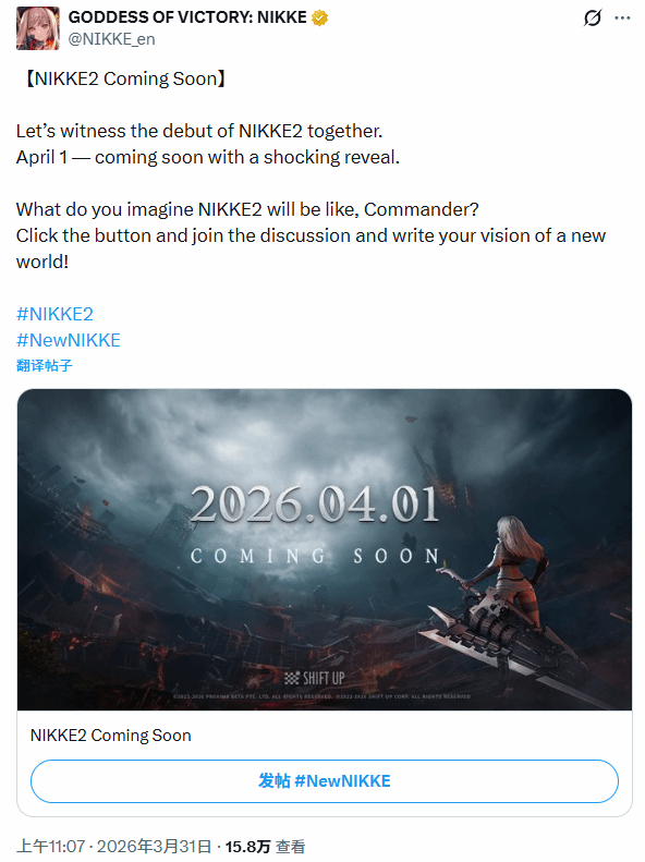 《胜利女神:新的希望》官方社交平台突然发布公告,确认《NIKKE2》即将到来,并首次公开了亮相时间——4月1日。