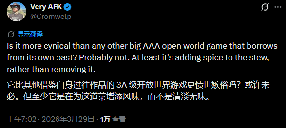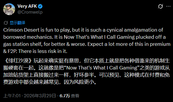 同时,Michael Douse也对这种玩法拼接的模式发表了自己的看法,他认为,这种设计未来可能会更多出现在高价3A游戏和免费游戏中,核心原因在于这种模式的风险更低,无需投入大量精力去打造原创核心玩法。不过他也补充道,这种“投机”未必比那些反复复用自身玩法的3A开放世界游戏更逊色,“至少它是在往游戏里添加内容,而不是偷工减料”。