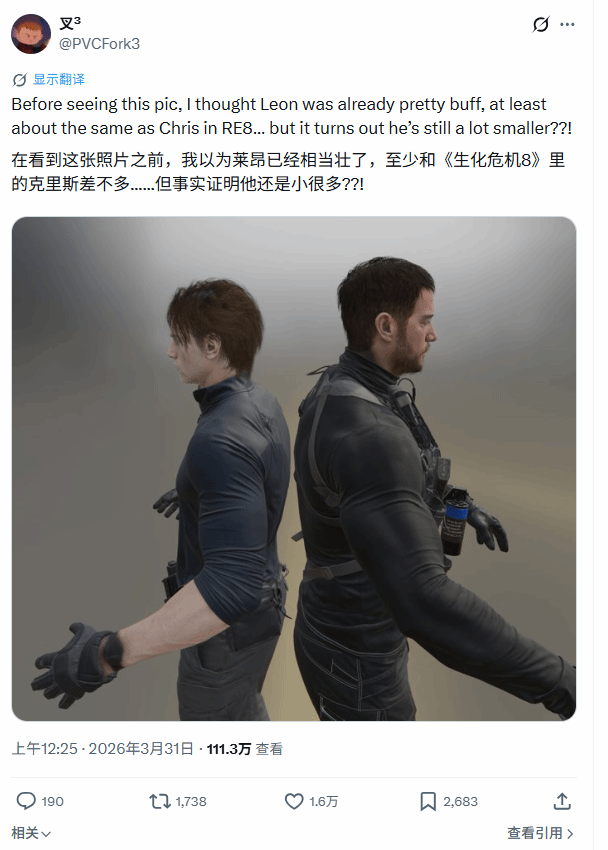 此前,《生化危机9:安魂曲》中里昂的身材膨胀问题,就已引发玩家们的广泛讨论。而近期,外网玩家又分享了一组里昂与系列前代主角克里斯的体型对比图,两者的差距十分悬殊,相较之下,里昂的身形显得格外娇小,甚至被玩家调侃“简直像个小萝莉”。