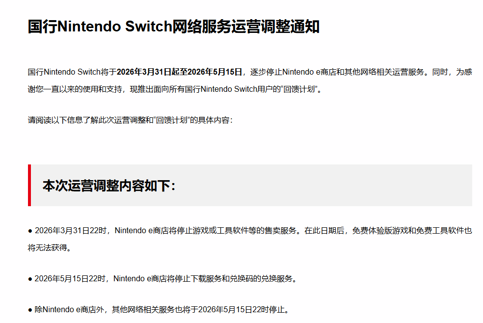 第二阶段则定于2026年5月15日22时,届时Nintendo e商店将停止所有下载服务及兑换码兑换业务,除e商店以外的其他所有网络相关服务,也会同步终止运营。