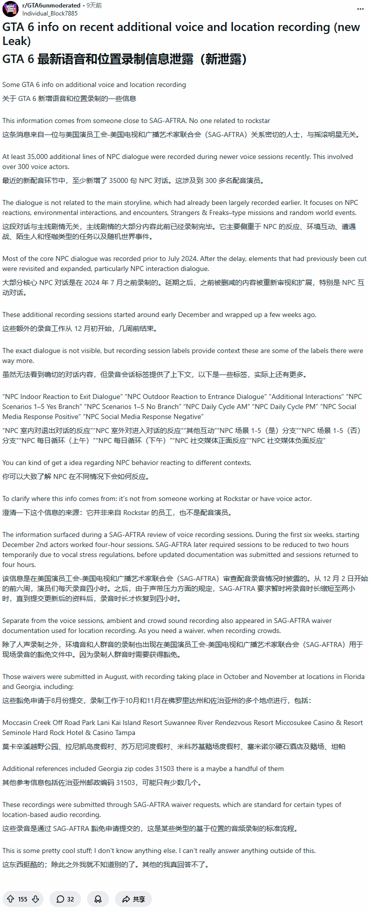 近日,《GTA6》相关Reddit板块流出新爆料,内容源自一位与SAG-AFTRA密切相关的知情人士,披露了游戏近期语音录制的关键进展,进一步透露本作在NPC互动与世界沉浸感上的发力方向。