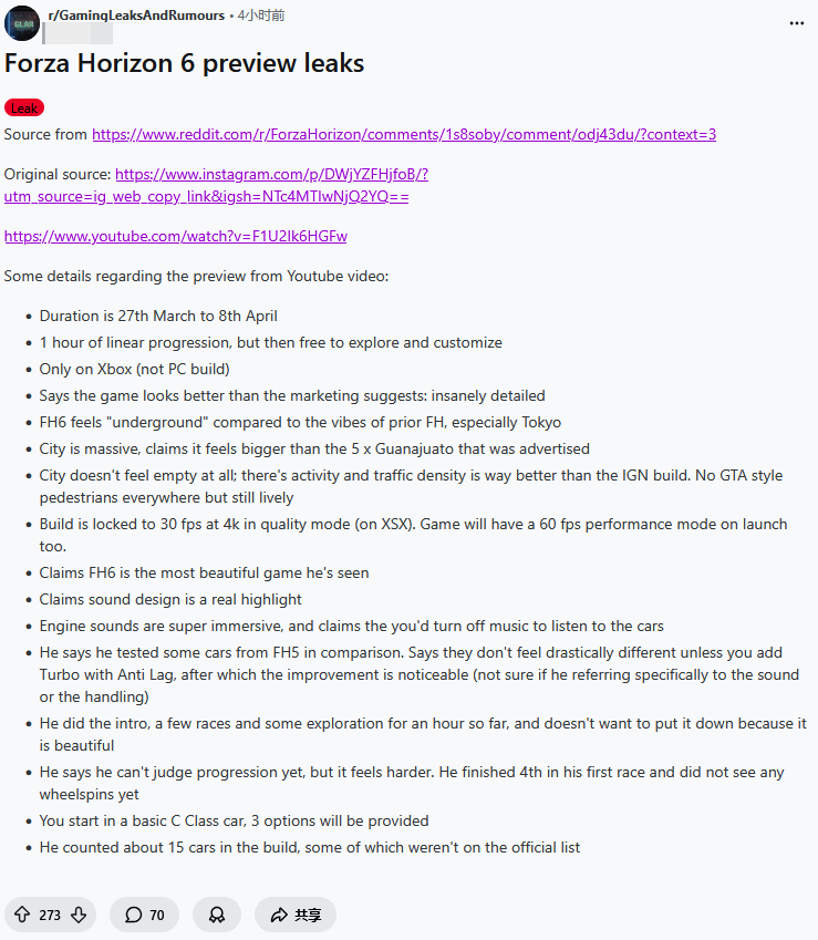 作为由Playground Games开发、Xbox发行的经典竞速续作,《极限竞速:地平线6》早已确定发售计划,将于5月19日登陆PC与XSX平台,2026年内登陆PS5。与此同时,游戏官方近期也宣布将开展试玩活动,此次偷跑评测,恰好提前泄露了试玩活动的部分细节与游戏实际表现。