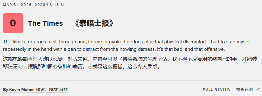 今日,这部影片的媒体评测结果陆续公布,英国知名媒体《泰晤士报》也同步发布了相关评测报告,不仅给出了0分的超低评价,还使用较为尖锐的言辞对该片进行了批评。