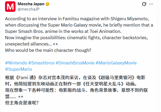 任天堂本部开发总监宫本茂(Shigeru Miyamoto)在接受《Famitsu》杂志专访时,在谈及《超级马里奥银河》电影相关话题的过程中,顺带透露了一则重要消息——东映动画正在着手制作《任天堂明星大乱斗》相关动画。