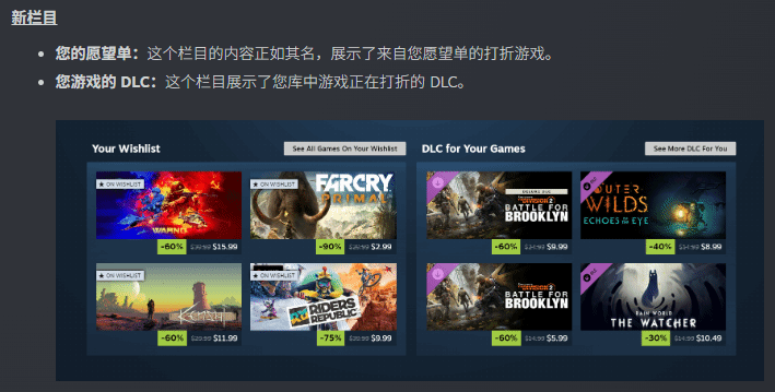 除了界面布局和视觉效果的优化,此次Beta测试更新还带来了两个实用的新栏目——折扣愿望单与折扣DLC,为玩家查找折扣内容提供了更直接的入口,进一步提升使用便捷度。