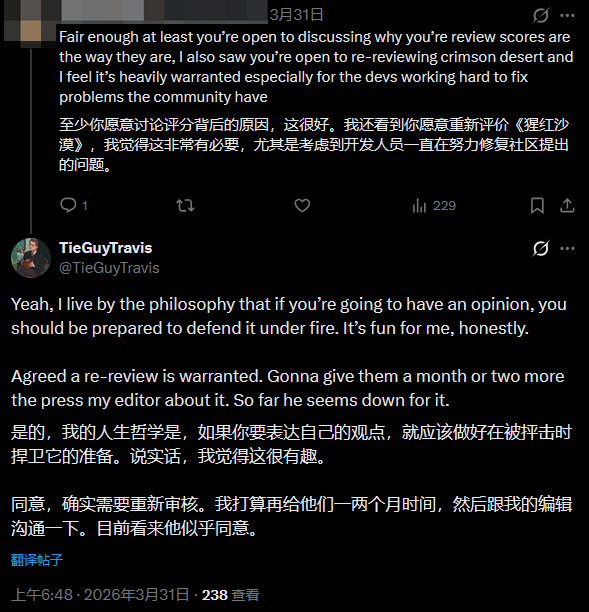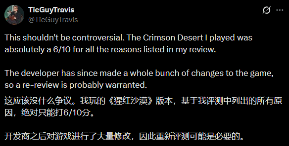 转机出现在近日,当初为《红色沙漠》打出6分的IGN编辑Travis Northup,在与网友的互动中公开表示,他认同“这款游戏值得重新评测”的观点。他透露,自己计划再等待一两个月,然后向团队争取重新评测的机会,且目前来看,这一想法得到了支持。