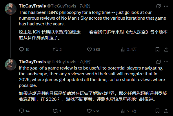 他还援引IGN过往的评测理念作为佐证,以《无人深空》为例,该作在不同版本迭代后,IGN曾多次进行重新评测。他强调,在当下这个游戏不断通过更新进化的时代,若评测的目标是为玩家提供可靠参考,那么称职的评测者就应意识到,在条件允许的情况下,评测本身也应与时俱进。