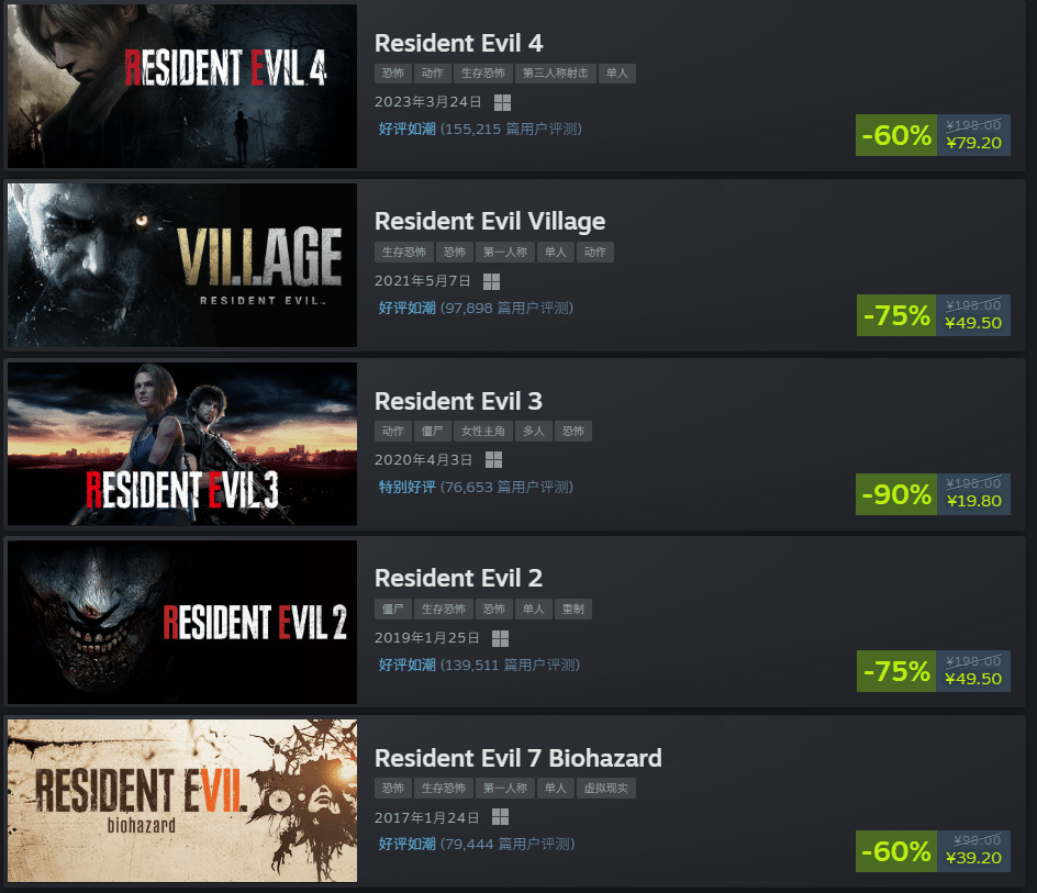 除此之外,系列其他作品也同步开启折扣:《生化危机5》《生化危机6》原价均为98元,均直降75%,折后价24.5元;《生化危机7》原价98元,降价60%后售价39.2元;《生化危机8:村庄》原价198元,75%折扣后仅需49.5元,无论是新玩家入坑还是老玩家补票,都十分划算。