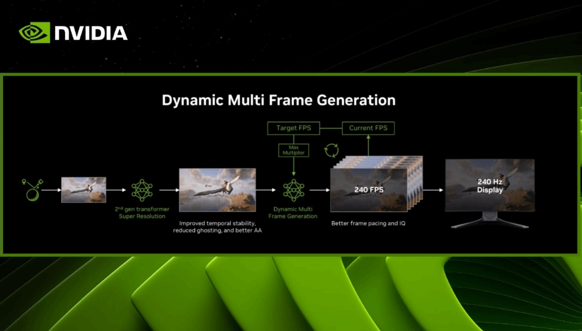DLSS 4.5最关键的升级的就是“动态多帧生成”功能:玩家可根据自身需求设定目标帧率,比如144Hz、240Hz甚至360Hz,系统会自动调节帧生成倍数,最高可达6倍,在保证画面质量的同时,最大化释放性能,实现性能与画质的平衡。