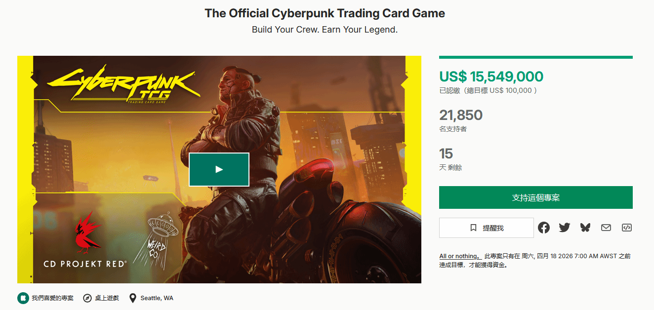 据悉,《赛博朋克TCG》最初在众筹平台设定的目标仅为10万美元,这样保守的目标,在不少人看来轻松就能突破。但没人预料到,这款卡牌游戏会迎来爆发式热度,截至发稿时,其众筹金额已突破1550万美元,折合人民币约1.06亿元,成功超越此前由《三界宙RPG》创下的1500万美元(折合人民币约1.03亿元)纪录,登顶Kickstarter游戏众筹榜首。