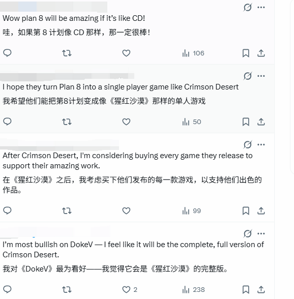 除上述作品外,机甲射击新作《Plan 8》也在稳步推进中。该作以“外骨骼动力装甲”为核心题材,定位开放世界射击游戏,与《多可比》共享BlackSpace引擎技术。得益于BlackSpace引擎的日趋成熟,以及《红色沙漠》积累的主机平台开发经验,《Plan 8》的后续开发时间有望大幅缩短。