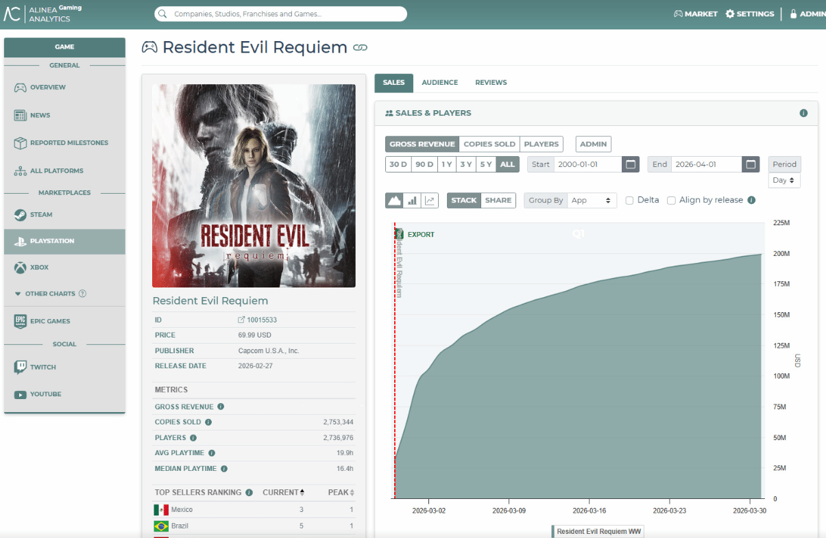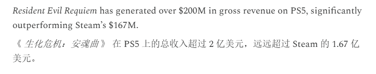 卡普空旗下《生化危机9:安魂曲》创下系列新纪录,这款新作以600万的销量,成为该系列有史以来卖得最快的作品,其中PS5平台的营收表现尤为突出,远超其他平台。