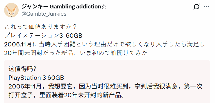 推主在发文时透露,当年买下这台PS3,纯粹是因为它在当时极度稀缺、一机难求,抱着“大家都在抢,我也想拥有”的心态入手。可买到手后,那种“终于拥有”的满足感,让他彻底失去了拆箱的念头,就这样将其尘封起来,一晃就是20年。直到近日,他才第一次打开外包装,还向网友好奇发问:“这玩意儿现在还有价值吗?”