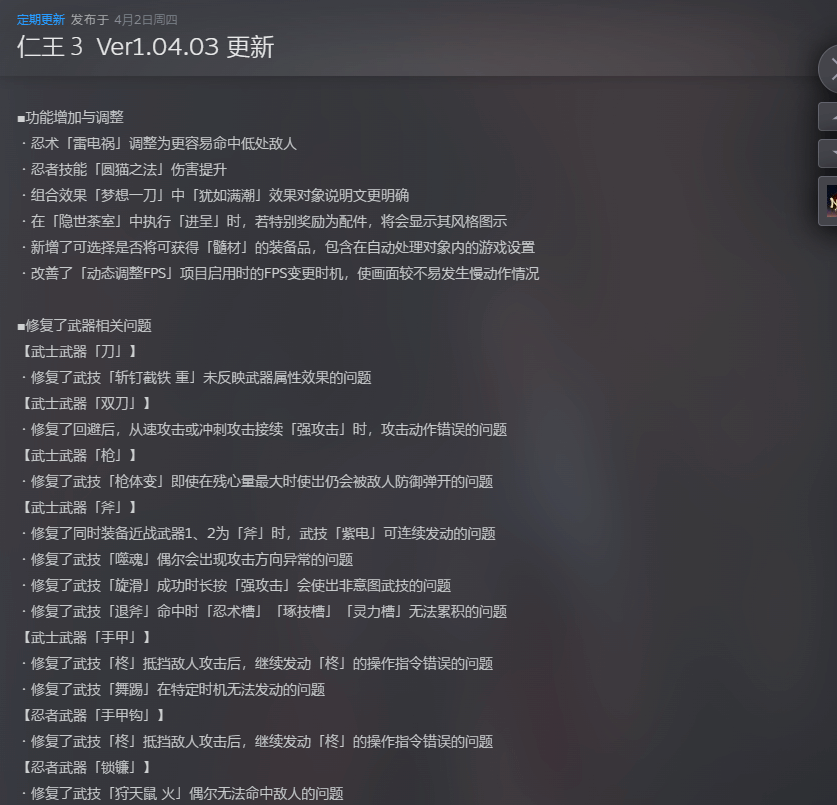 本次更新的核心亮点的是全面且有针对性的内容优化,整体分为三大方向,每一项调整都精准对应玩家反馈的实际问题,没有多余冗余的内容。其中,武器相关的BUG修复是本次更新的重中之重,毕竟武器系统作为《仁王3》战斗玩法的核心,其流畅度直接决定玩家的游戏体验。