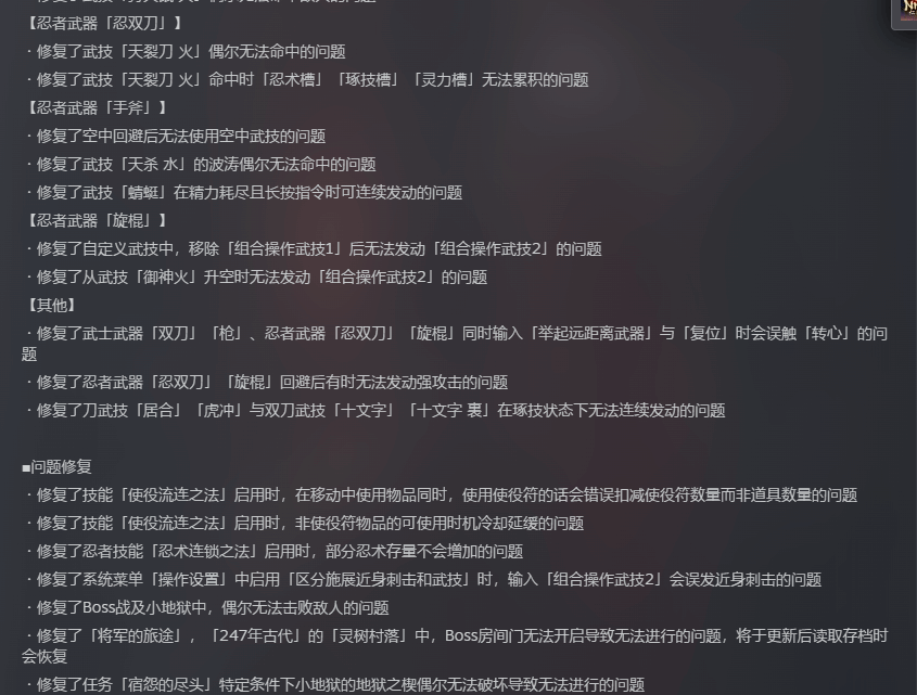 忍者武器的修复同样不留死角,手甲钩、锁镰、忍双刀、手斧、旋棍等各类武器的武技异常均被逐一解决。比如手甲钩武技「柊」的操作指令错误、锁镰武技「狩天鼠 火」偶尔无法命中的问题,忍双刀武技「天裂刀 火」命中后无法累积能量槽的漏洞,以及手斧空中回避后无法使用空中武技、旋棍自定义武技衔接异常等问题,都在本次更新中得到妥善处理。除此之外,武士武器与忍者武器共通的部分操作BUG,像双刀、枪等武器误触「转心」、忍双刀回避后无法发动强攻击等,也一并完成修复。