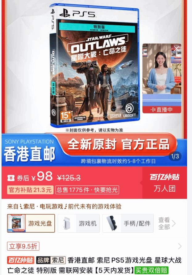 育碧旗下开放世界3A大作《星球大战:亡命之徒》PS5实体光盘,近期开启史低促销活动,到手价仅需98元,成为这段时间主机游戏市场里性价比极高的选择。
