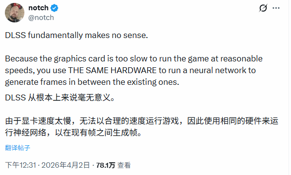《我的世界》创始人Notch近期在社交平台X上发表了对英伟达DLSS技术的看法,直言这项技术从设计逻辑上就没有实际价值。他认为显卡本身运算能力就有限,还要分出资源运行AI来生成画面,完全是多此一举。