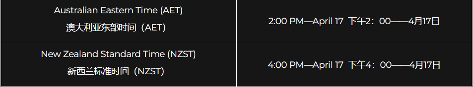 卡普空官方已对外公布了该作在全球不同地区的发售时间,因时区差异,各地区解锁时间略有不同:中国标准时间(CST)为4月17日凌晨12点;太平洋时间(PT)为4月16日晚上9点,中部时间(CT)为4月16日晚上11点;东部时间(ET)和巴西利亚时间(BRT)分别为4月17日凌晨12点、1点;欧洲及亚洲部分地区中,英国夏令时(BST)为4月17日上午5点,中欧夏令时(CEST)为上午6点,韩国、日本标准时间(KST、JST)为下午1点,澳大利亚东部时间(AET)为下午2点,新西兰标准时间(NZST)为下午4点。