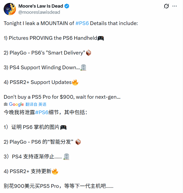 他在推文中表示,会在今晚公布数量众多、细节详尽的PS6(PlayStation 6)相关信息,还直接提醒玩家:“别花900美元入手PS5 Pro了,不如等等次世代主机。”
