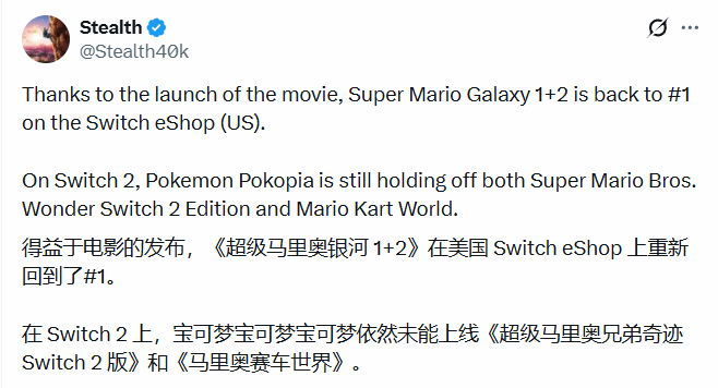 伴随《超级马里奥银河大电影》的正式上映,马里奥系列相关游戏的热度也随之水涨船高。外网博主@Stealth40k透露,经典游戏《超级马里奥银河1+2合集》顺势崛起,成功登顶美国区Switch eShop销量榜单,展现出强劲的市场号召力。值得注意的是,这部带动游戏热度的电影,媒体口碑并不突出,却意外实现了对经典游戏的流量赋能。