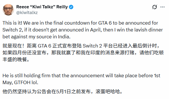 业内知名爆料人Kiwitalkz今日对外披露了一条关于《GTA6》的全新消息,而这条消息的源头,来自一位印度消息人士。据该印度消息人士透露,《GTA6》将在4月份内官宣登陆NS2平台,其原话明确表示,最晚不会超过5月1日。