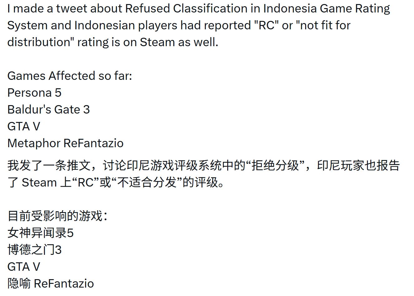 为了弄清具体规则,该博主此前已向Steam官方咨询相关事宜,Steam方面回应称,印尼区的游戏分级会参照德国等地区的标准执行,但对于“拒绝分级(RC)”的具体执行细则,目前暂未掌握。