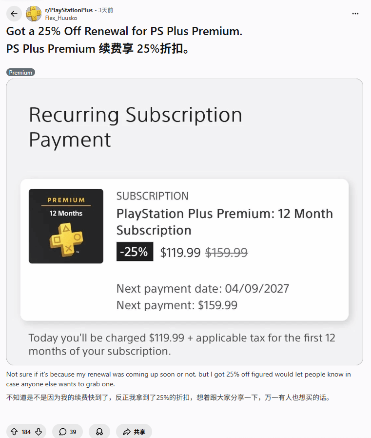有玩家在Reddit平台分享了自己的优惠经历,其在为Premium档位续费时,成功获得了25%的折扣优惠。但这份福利并非随机发放,而是有着明确的触发前提——通常只有在玩家的年费会员即将到期时,才会出现该折扣,其核心目的大概率是为了吸引用户继续续订,而非选择取消服务,本质上是索尼留住存量用户的一种手段。